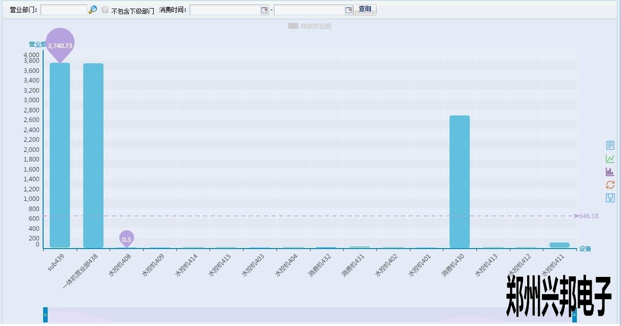 這是一個柱狀的數(shù)據(jù)圖表,展示了各個終端在所查詢時間內(nèi)的營業(yè)情況,那么最下面的那條橫杠是什么呢?其實那是一個工具條,用來集中顯示某個具體的柱狀數(shù)據(jù),如水控機409以及后面的幾個數(shù)據(jù)都看不大清楚,想要拉近一點看看,怎么做呢,很簡單,只要拉動最下面的工具條就好了,就像這樣: